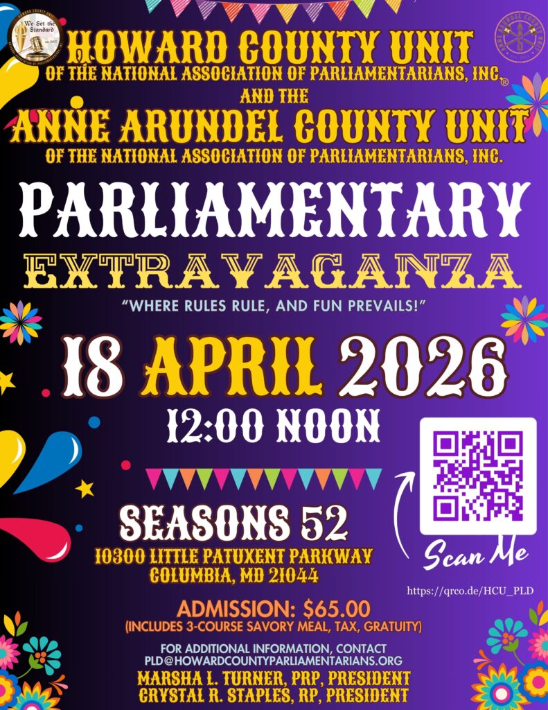 Come join the Howard County and the Anne Arundel County Units for an afternoon filled with knowledge and discussions about parliamentary law at the 2026 Parliamentary Law Day! This in-person event will take place on Saturday, April 18, 2026 at the exquisite venue, Seasons 52. Get ready to dive into the world of parliamentary procedures and learn from experts in the field.